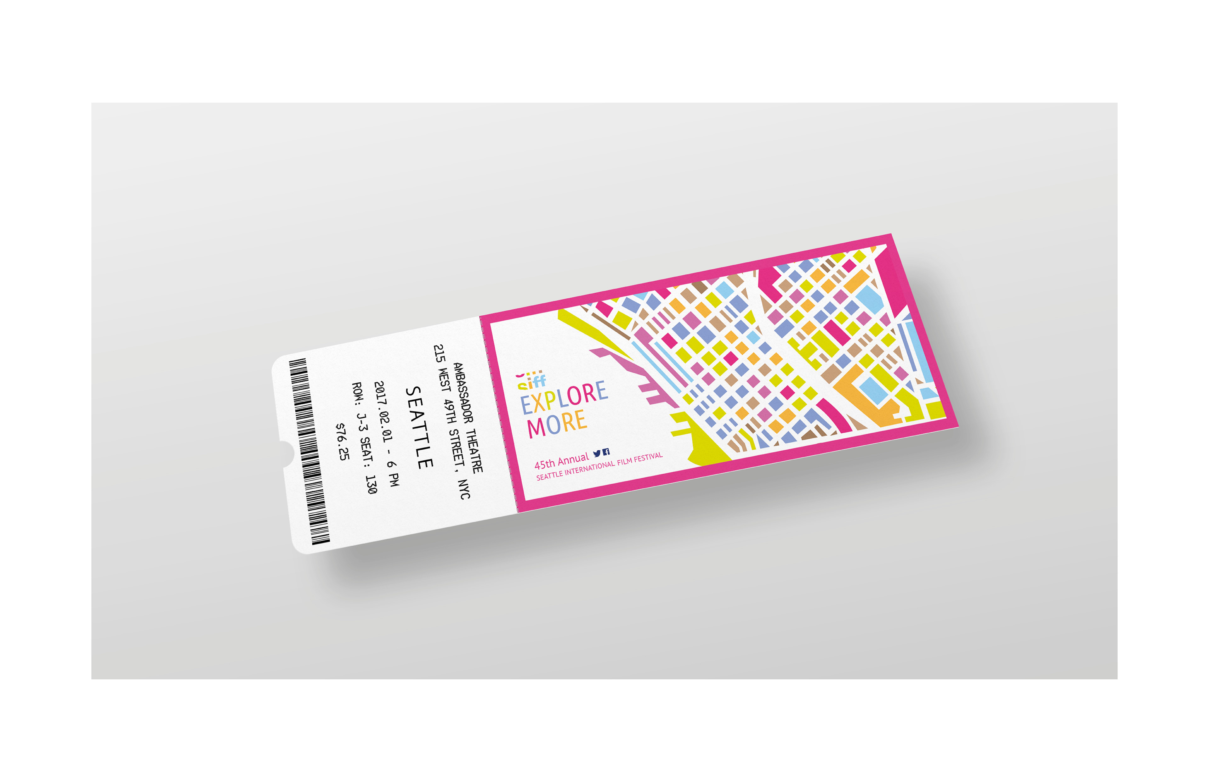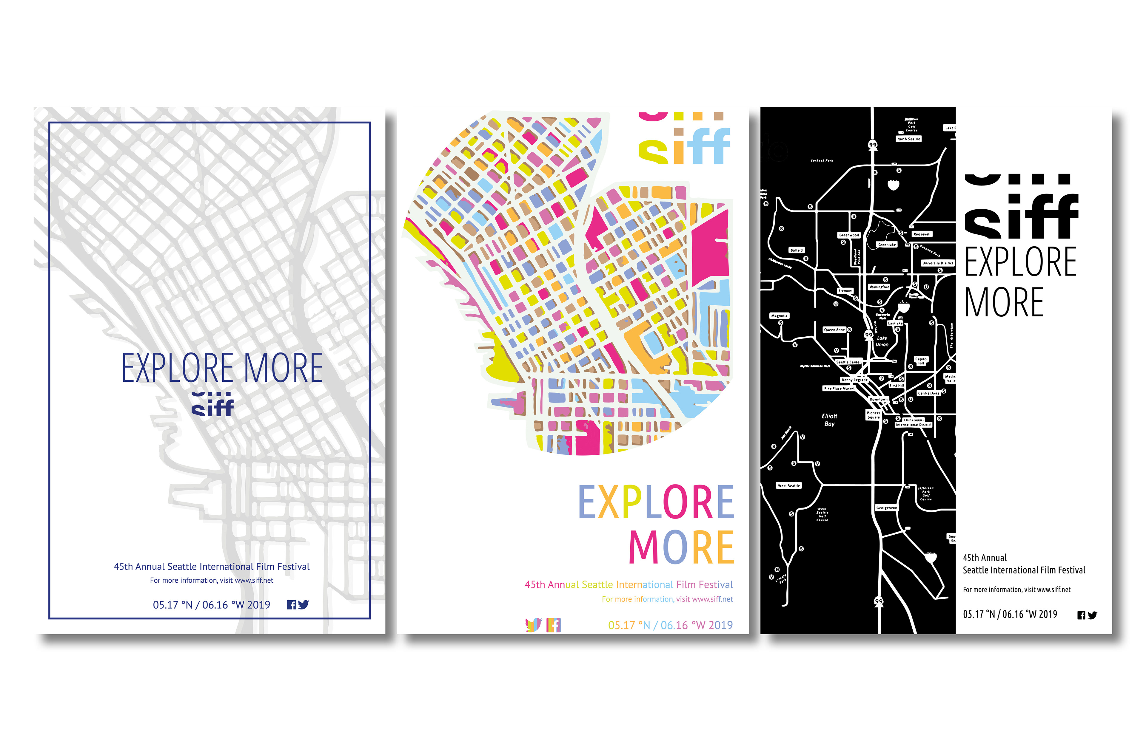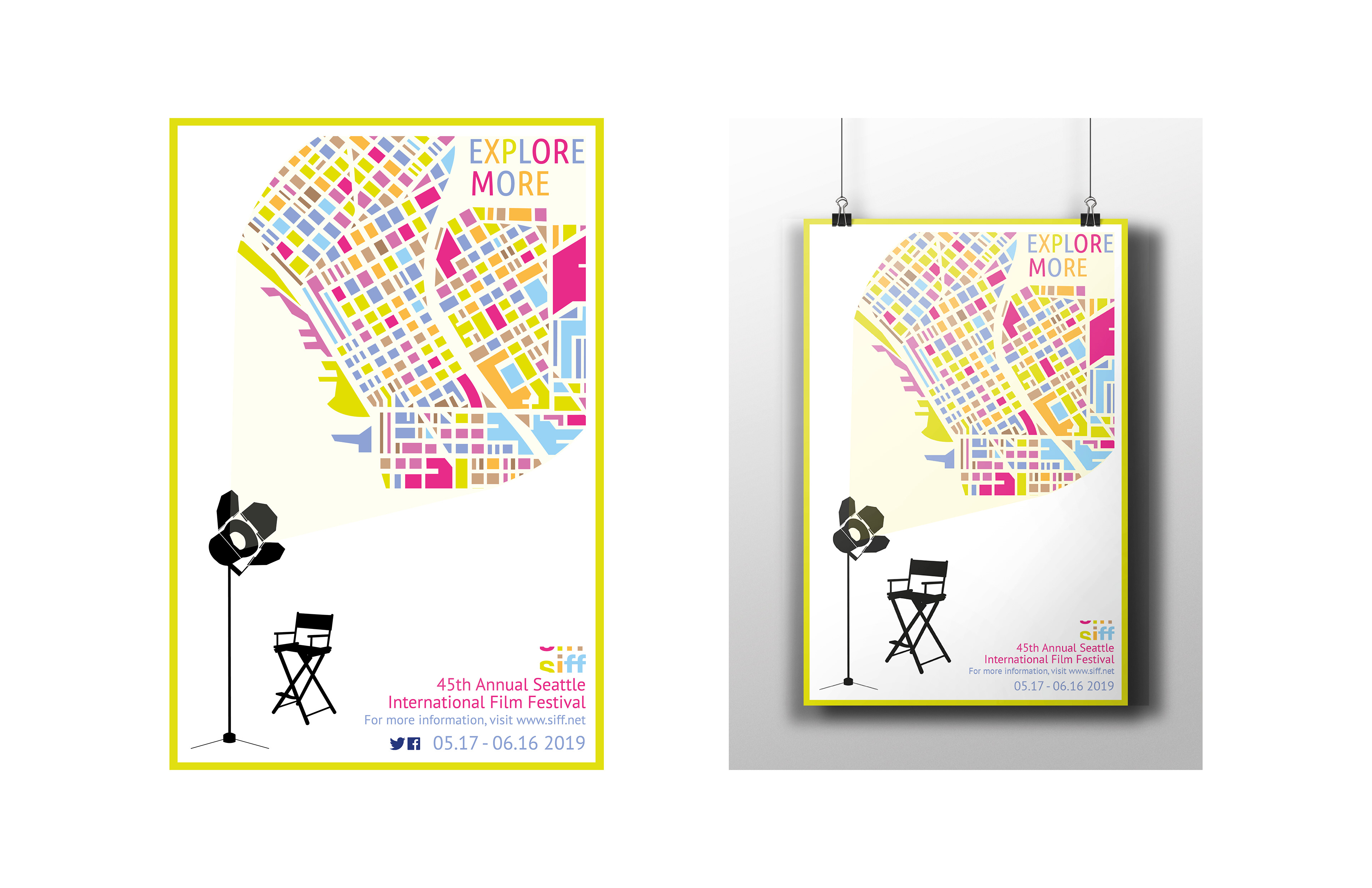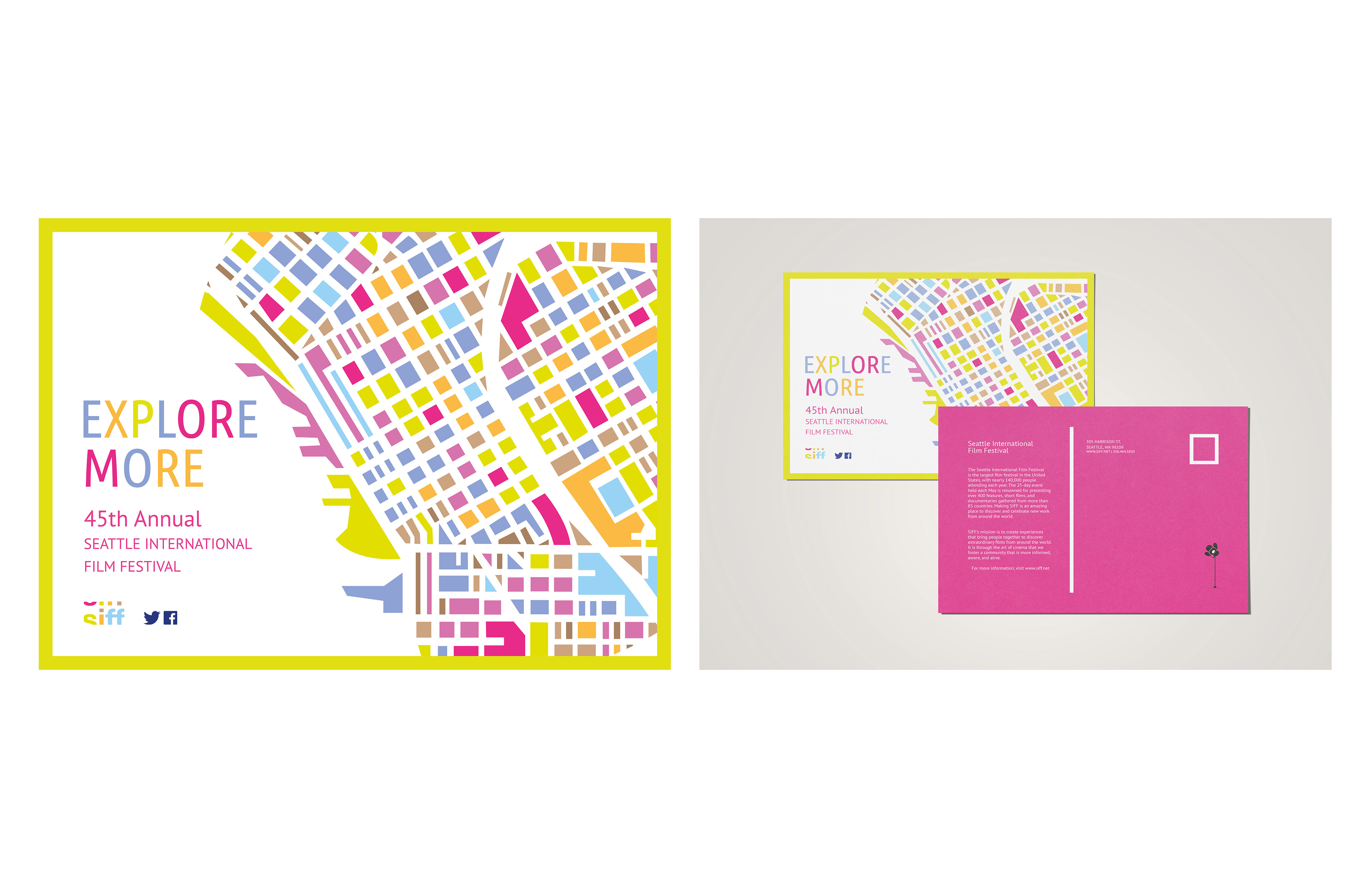 Using the appropriate colors to match the title "Explore More", and put Seattle's map in order to help people from other places to understand the SIFF. The report will include poster, brochure(use infographic to show statistic and demographics), postcard, banner display(booths), tickets and social media (e.g., Facebook, Twitter, SIFF home/ secondary pages).