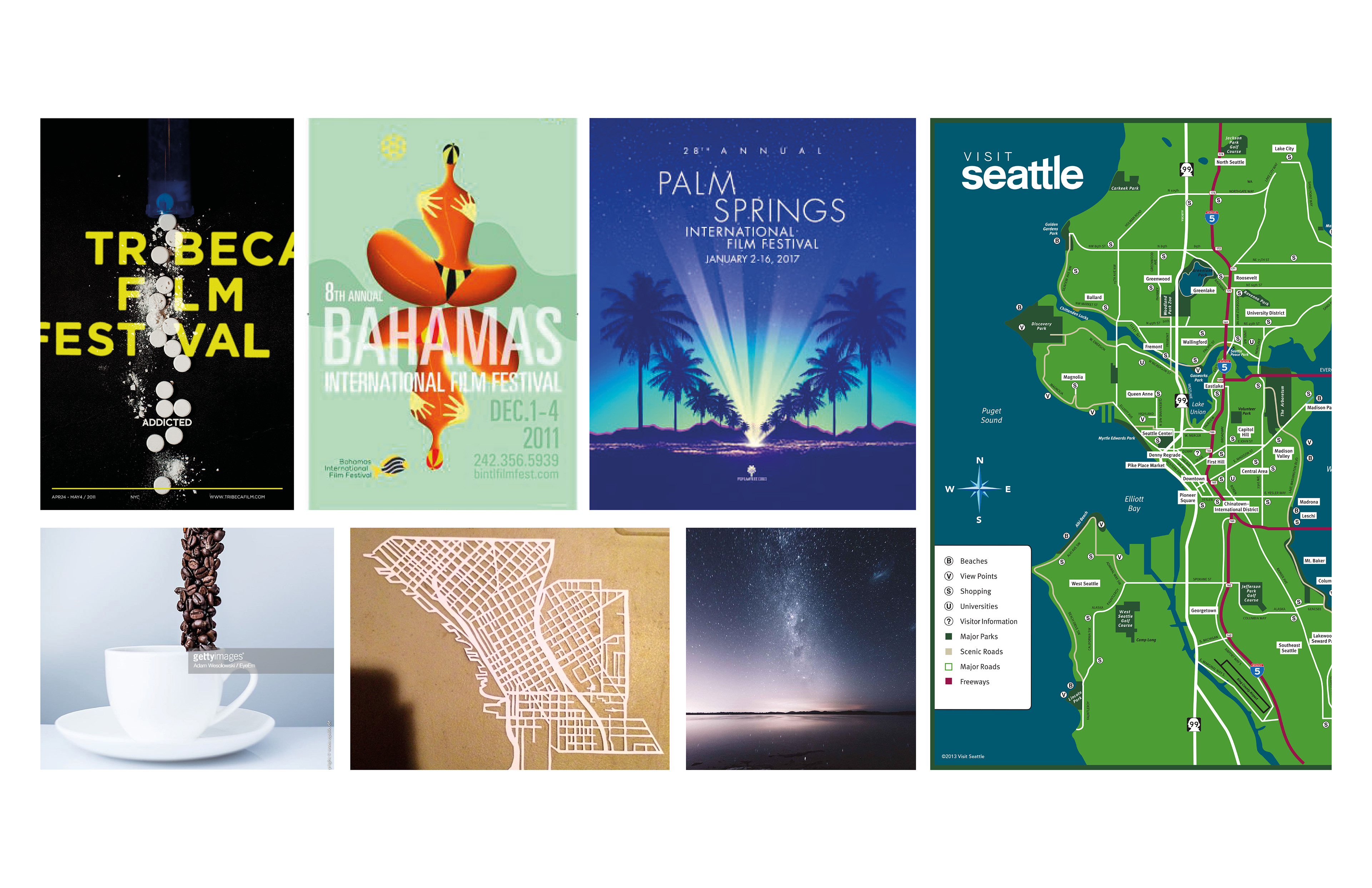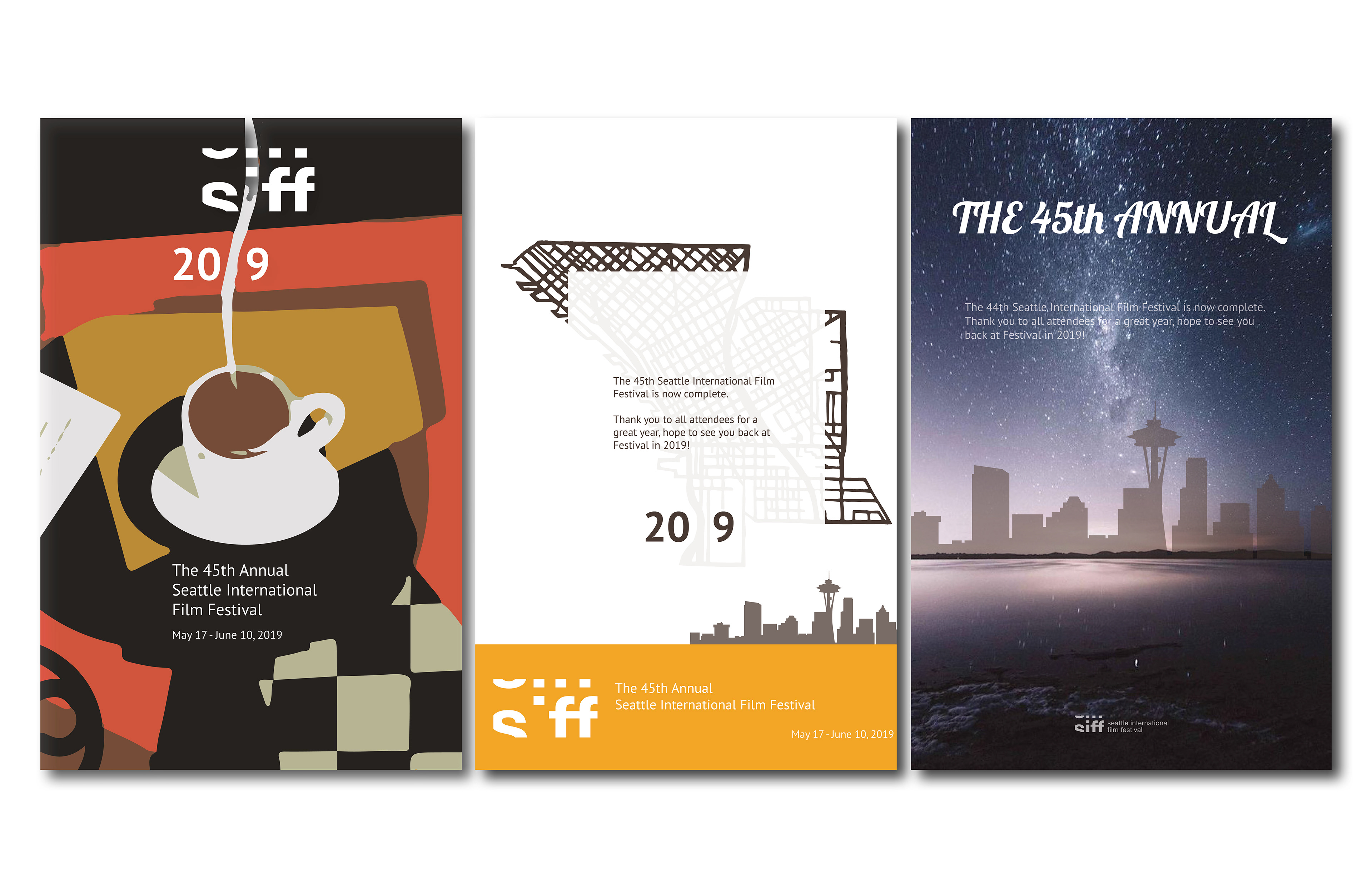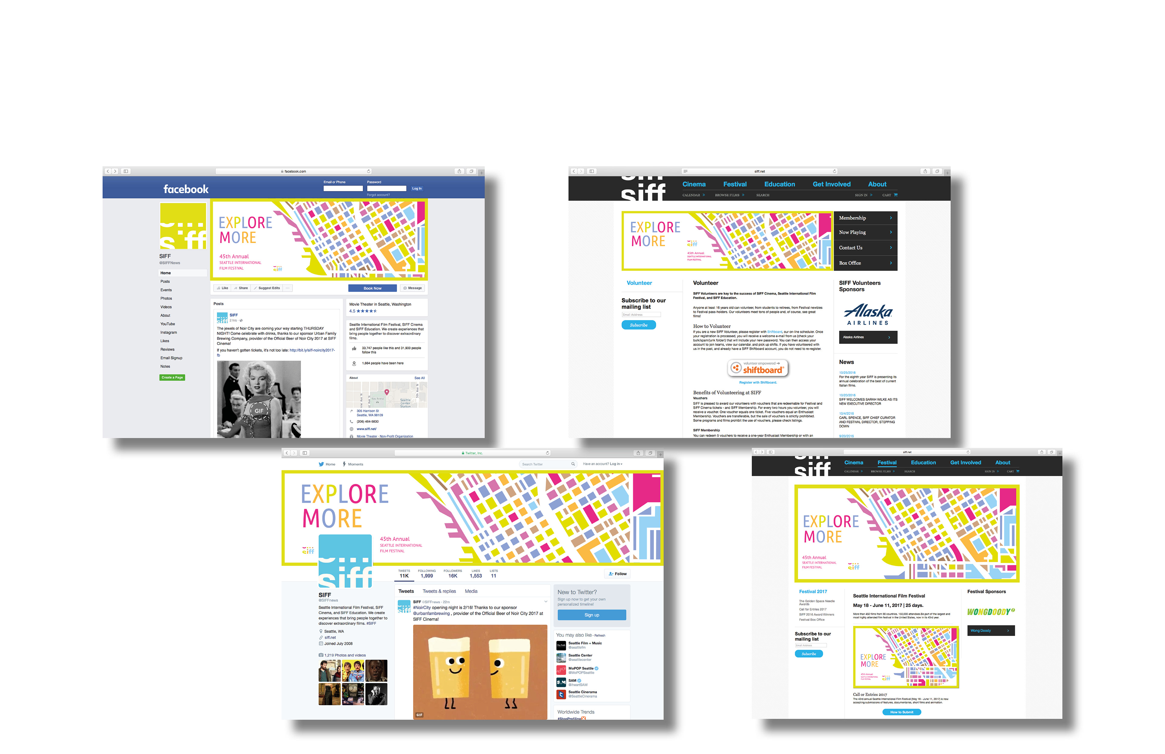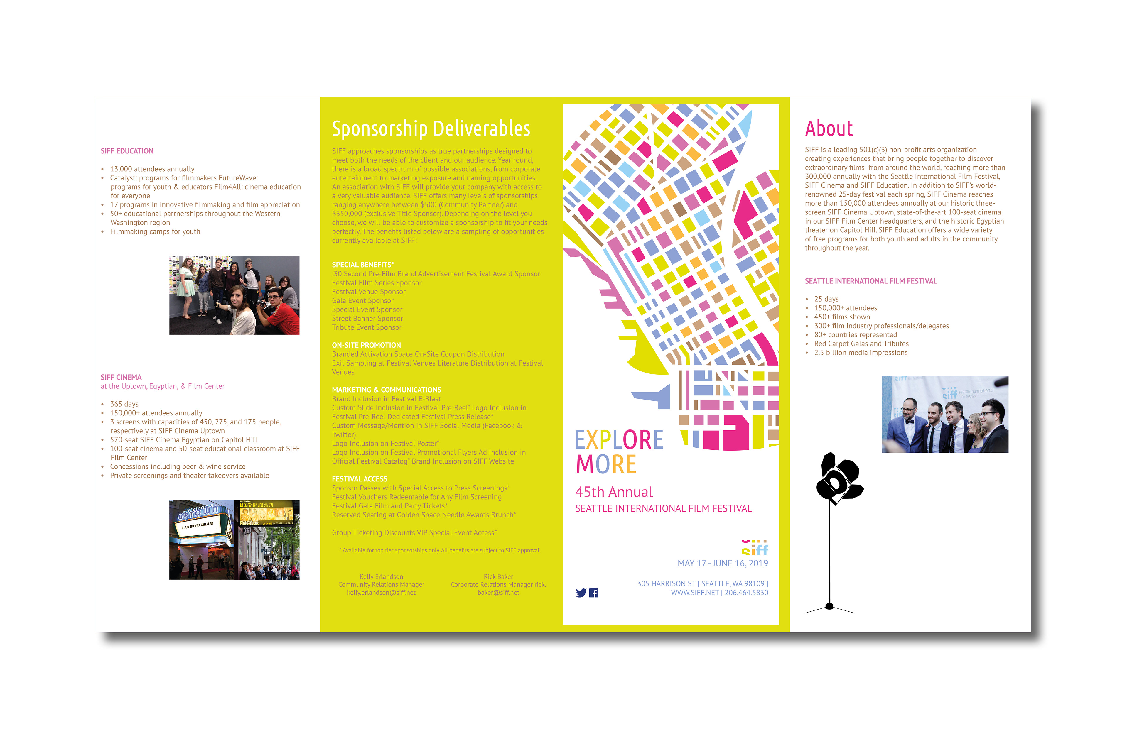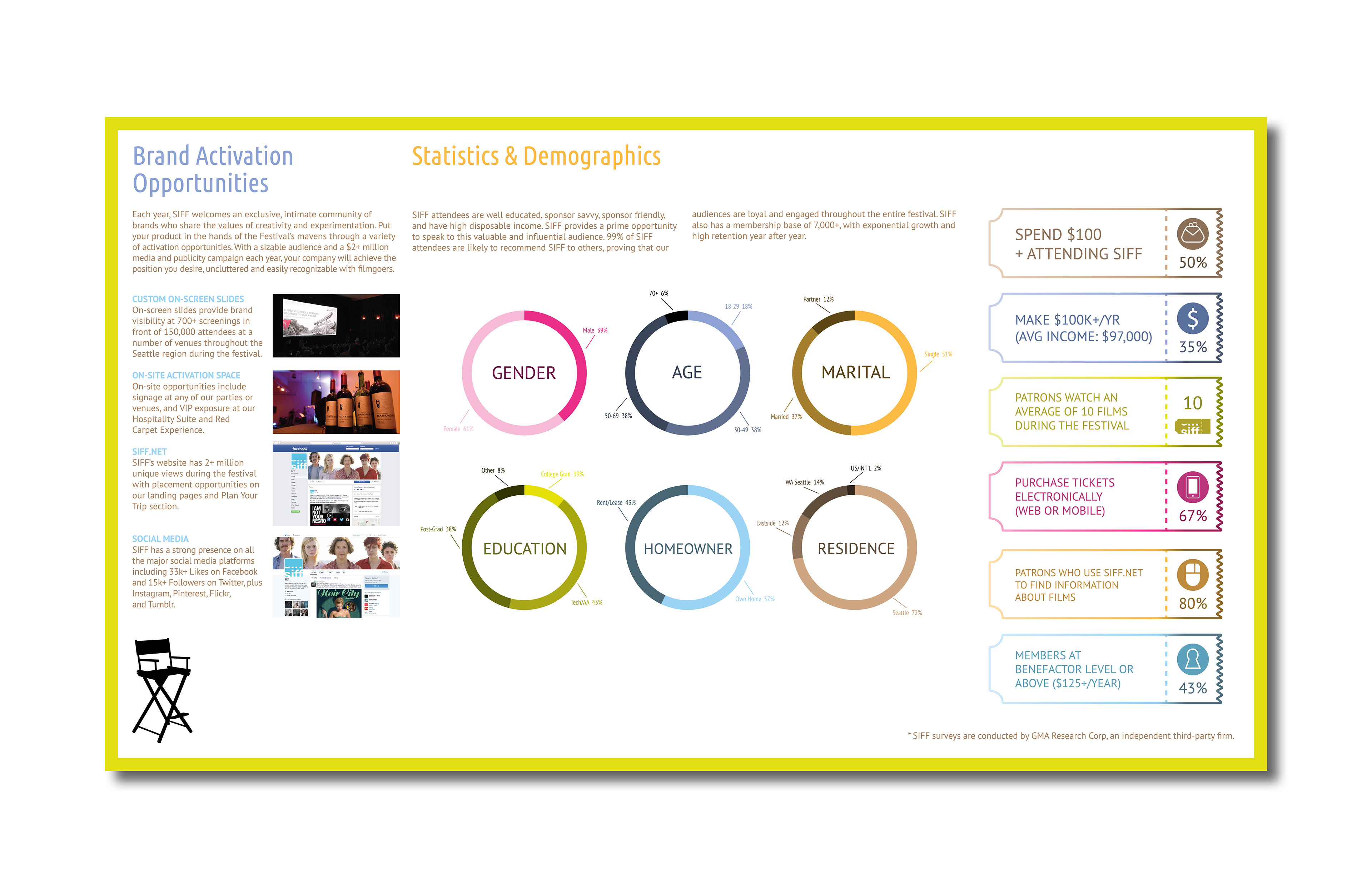 Using the appropriate colors to match the title "Explore More", and put Seattle's map in order to help people from other places to understand the SIFF. The report will include poster, brochure(use infographic to show statistic and demographics), postcard, banner display(booths), tickets and social media (e.g., Facebook, Twitter, SIFF home/ secondary pages).
